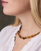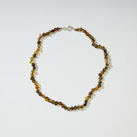 Each necklace is made from genuine Baltic Amber – a fossilized tree resin formed over millions of years. Known for its soothing energy and warm, golden glow, amber has been treasured since ancient times. Because it is a natural material, each piece is beautifully unique in both color and shape.